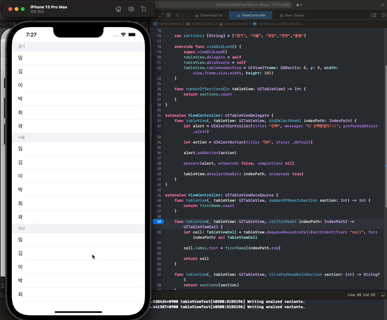 두 프로토콜을 채택한후 필수적으로 정의해야하는 메소드는 UITableViewDataSource에 2가지가 있다.