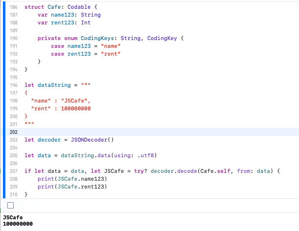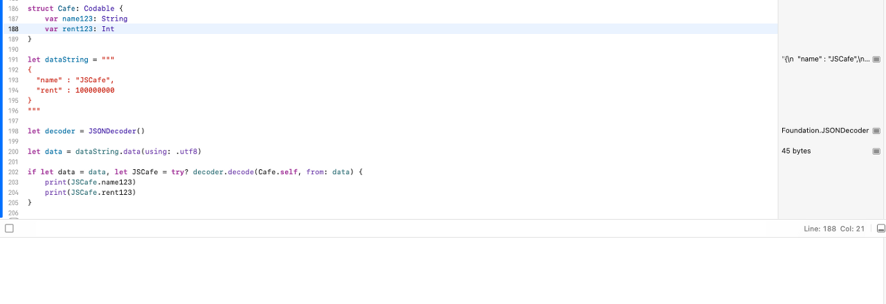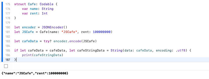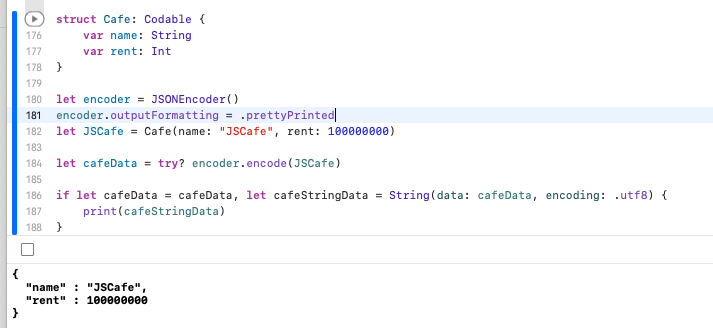 우선 Cafe 타입이 Codable 프로토콜을 채택함으로써 Cafe 타입은 JSON으로 변환될 수도 있고, JSON이 나(Cafe)로 변환될 수 있음을 알렸다.