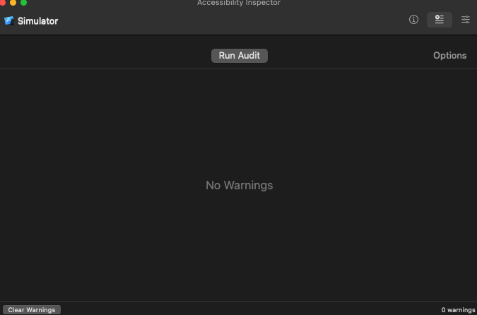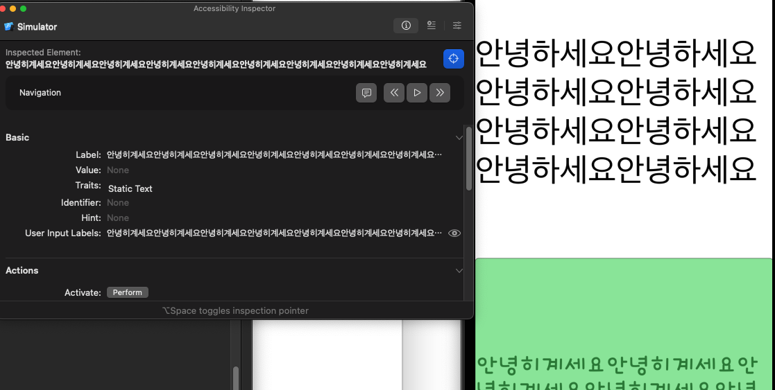 위 gif들을 보면 어떤 창 내부를 누르니깐 폰트 사이즈 변경되고 그러는 것을 볼 수 있을텐데 저게 시뮬레이터에서 접근성을 확인, 테스트할 수 있는 Accessibility Inspector이다.
