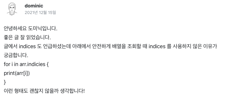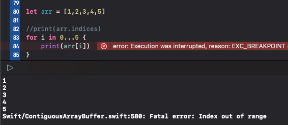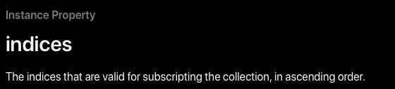 예를 들어 arr이라는 배열의 요소가 [1, 2, 3, 4, 5]로 5개의 요소를 갖고있으므로 indices의 값은 0..<5으로 유효한 범위를 갖는다.