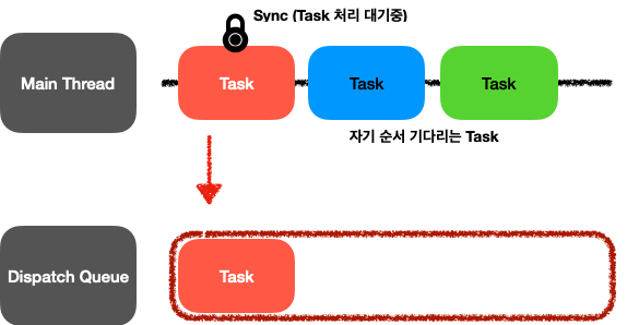 메인스레드는 Task 1을 큐에 보내고 해당 Task가 처리될 때까지 아무것도 하지 않고 오로지 처리되기만을 기다린다.