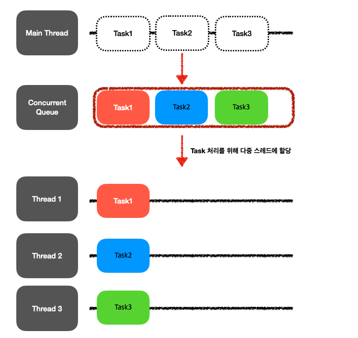 Concurrent Queue에 작업을 배치시키면 큐는 다른 여러 스레드에 작업을 할당하여 처리한다.