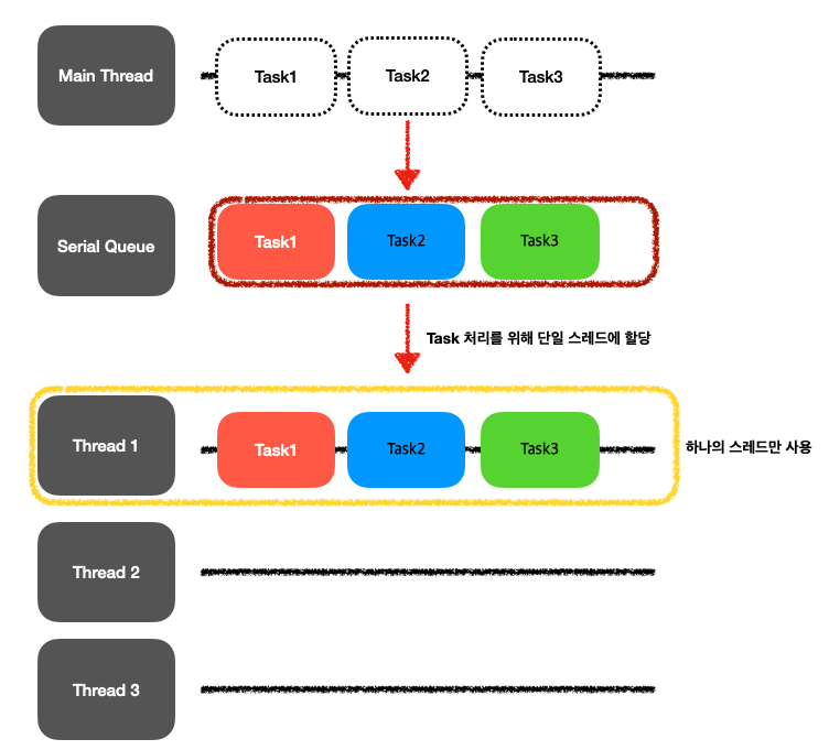 Serial Queue에 작업을 배치시키면 큐는 다른 하나의 스레드에 작업을 할당하여 처리한다.