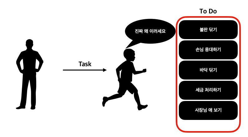 주어진 일을 하나씩 처리해야하는데, 불판 닦고, 손님 응대하고, 바닥 닦고, 세금 처리까지 다 하고 사장님 애를 봐야한다.