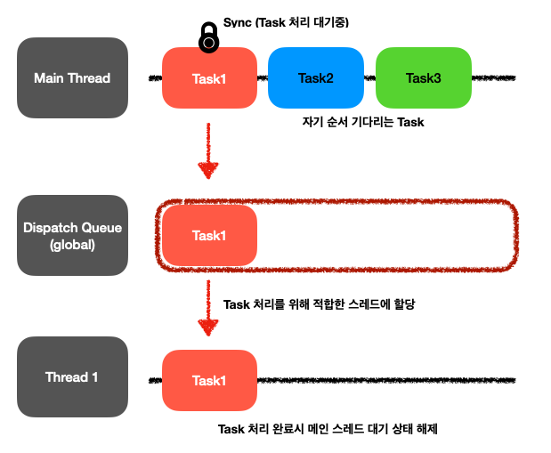 SerialQueue.sync : 메인 스레드에서 Serial Queue로 작업을 넘기고 해당 작업이 끝날 때까지 기다린다. (sync) / Serial Queue로 넘겨진 작업은 하나의 스레드에서 처리되기 때문에 하나의 스레드에서 먼저 처리되고 있는 작업이 있다면 그 작업이 끝나고 작업이 시작된다. (Serial Queue)