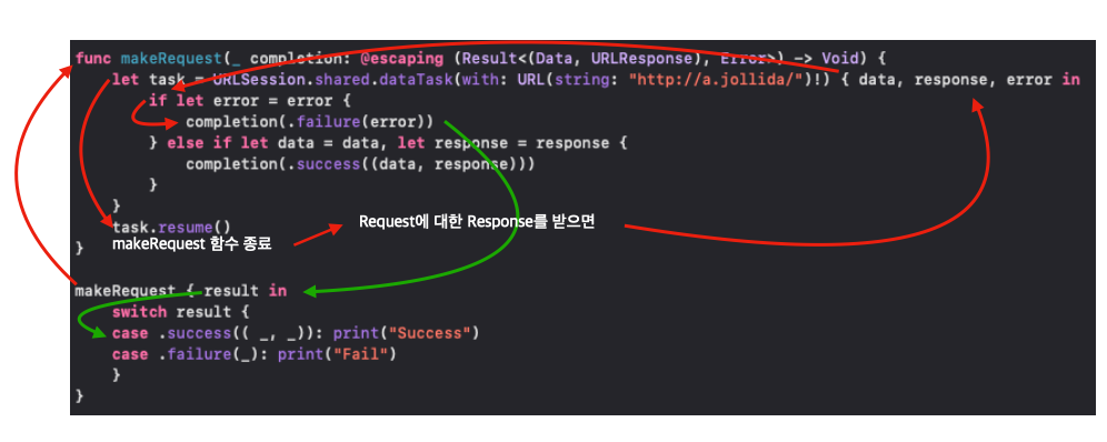 dataTask의 클로저는 비동기로 네트워크 요청을 보내 응답이 오면 dataTask의 completion 함수가 호출되고, 내부에서 조건에 따라 makeRequest의 completion을 호출 하는 것이다.