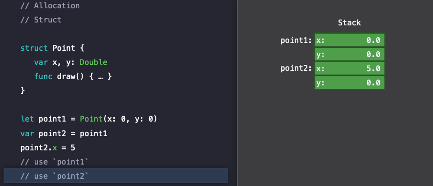 struct 인스턴스를 생성하여 특정 변수(let point1)에 할당하면, 인스턴스가 가졌던 값들이 전부 복사가 되어 할당된다.