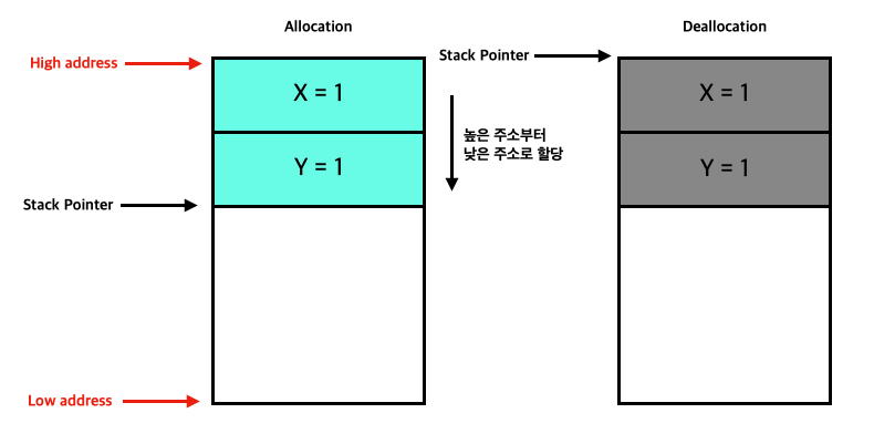 스택 포인터를 단순히 줄임으로써 메모리를 할당할 수 있고, 스택 포인터를 다시 올림으로써 메모리 할당을 해제시킬 수 있다.