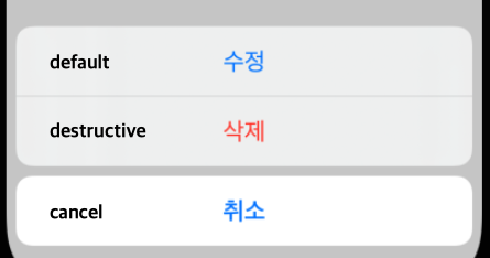 let modifyAction = UIAlertAction(title: "수정", style: .default, handler: nil)