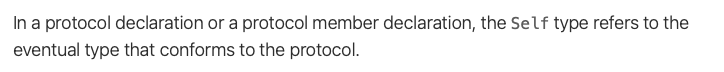 프로토콜 내부의 Self는 자신(프로토콜)이 아닌 자신을 채택한 타입을 의미한다.