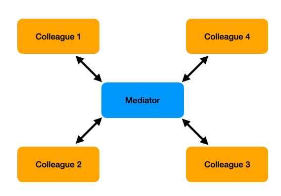 객체간의 종속성을 줄일 수 있는 패턴으로, 여러 Colleague들 사이를 Mediate하는 역할을 하는 인터페이스가 존재한다.
