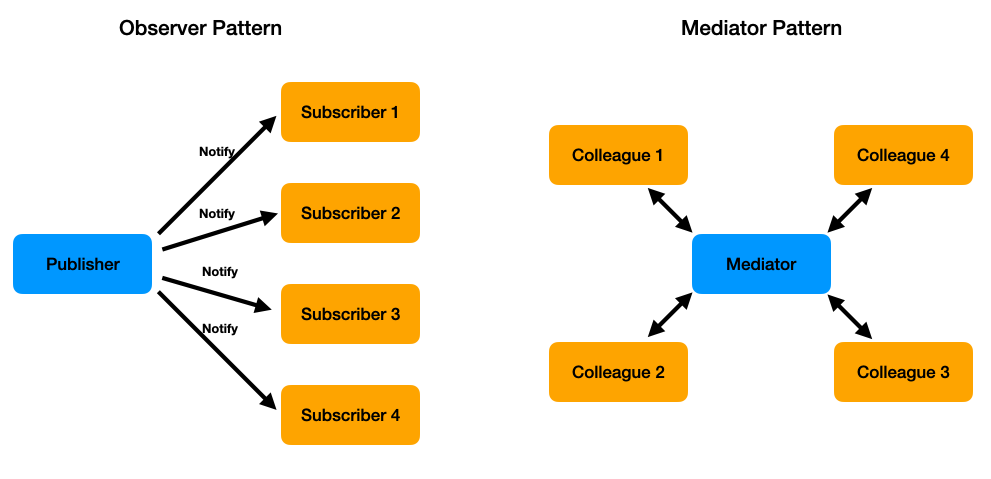하지만 Mediator Pattern의 경우 M개의 Publisher와 N개의 Subscriber가 존재하고, Publisher와 Subscriber가 1개의 Mediator를 통해 통신하는 방식이다.