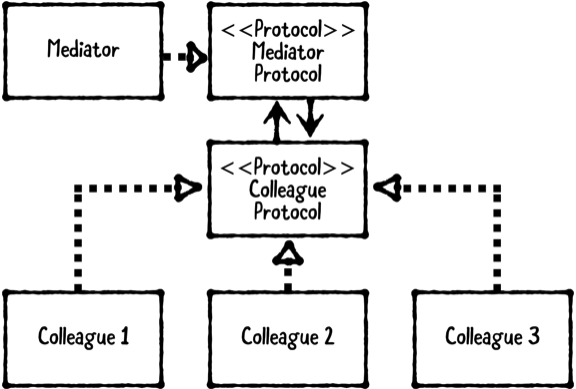 저 통신 관계간에 새로운 객체를 추가하고 싶다면, Colleague를 추상화하여 새로운 객체가 해당 프로토콜을 채택하면 통신 관계에 쉽게 낄 수 있다.