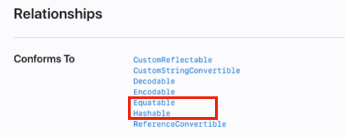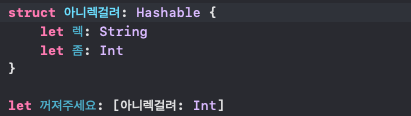 Set, Dictionary의 key 등의 유일한 값으로 사용하기 위해서는 Hashable을 준수하고 있어야 한다.