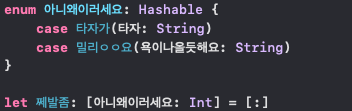 let 쩨발좀: [아니왜이러세요: Int] = [:]