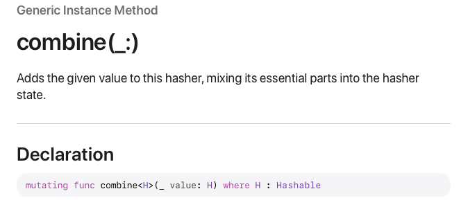 그리고 보면 mutating 메서드임을 알 수 있는데, 이는 combine 메서드가 Hasher 라는 구조체의 메서드이고 구조체의 프로퍼티 값을 변경하므로 mutating인 것 같다.