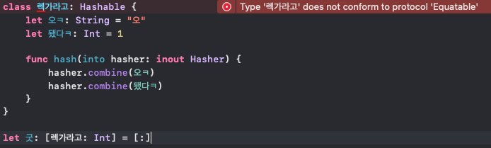 이 에러가 발생하는 이유는 Hashable은 Equatable을 상속받고 있기 때문이다.
