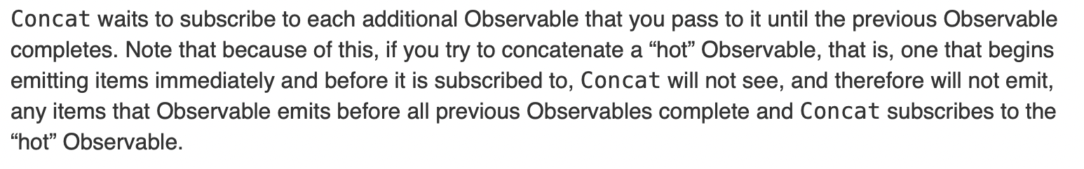 이외에 주의할 점은 Hot Observable의 경우 구독을 하지않아도 이벤트를 방출하고 있으므로 직렬 연결된 Observable을 순차적으로 구독하여 실행하는 concat의 경우엔 Hot Observable의 순서가 오기전에 방출된 Hot Observable의 이벤트는 전부 무시되기 때문에 적절치 못하다.