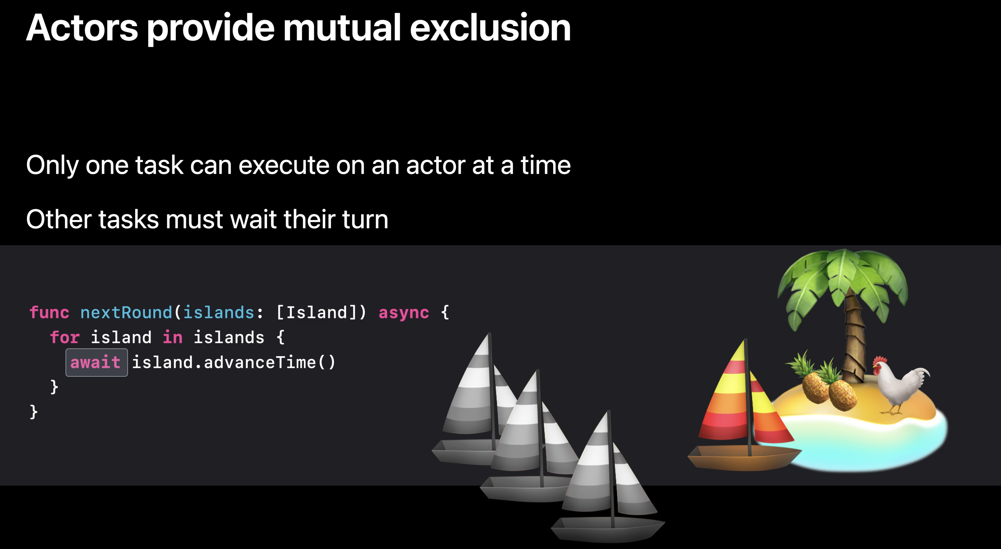 Actor는 각각의 독립적인 상태(shared mutable state)를 가지고 있으며, 해당 상태에 대한 접근을 동기화(Others tasks must wait their turn)하여 Data Race를 방지한다.