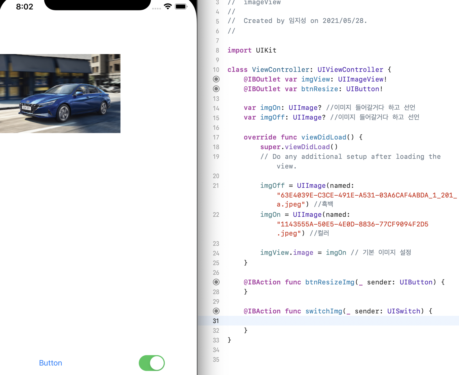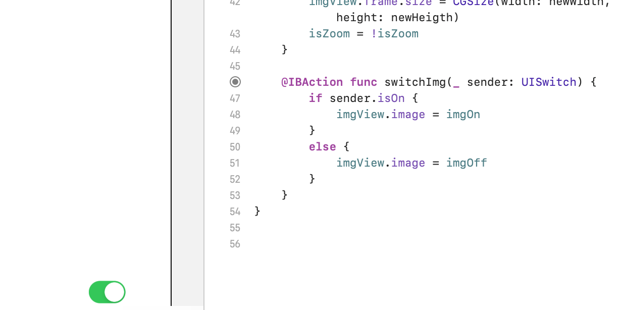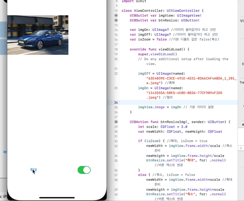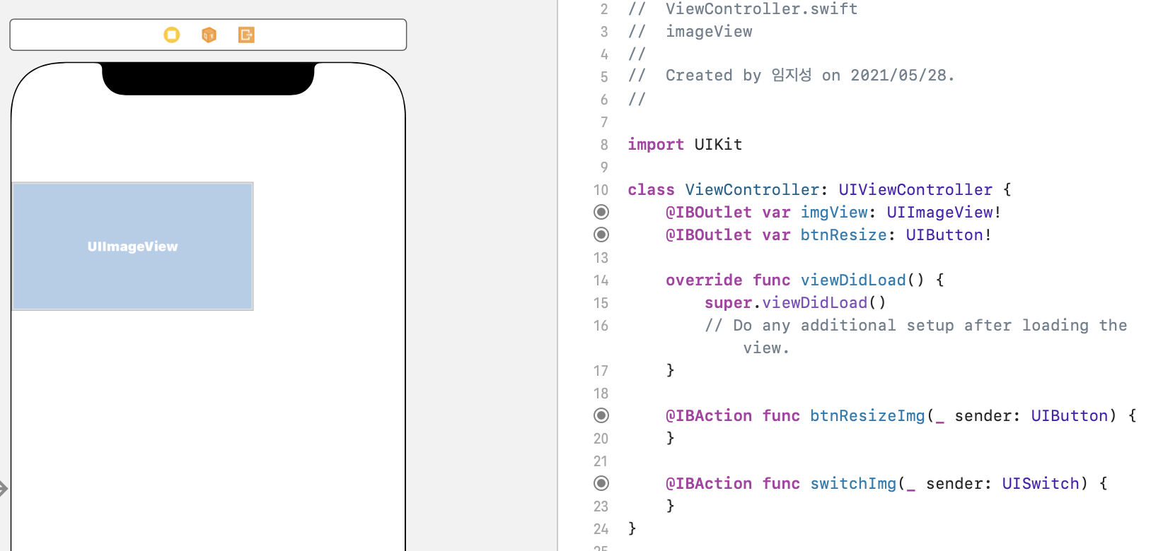 추가를 해줬으니 이제 추가한 이미지뷰, 버튼, 스위치객체를 연결할 아웃렛 변수와 액션함수를 추가해보자
