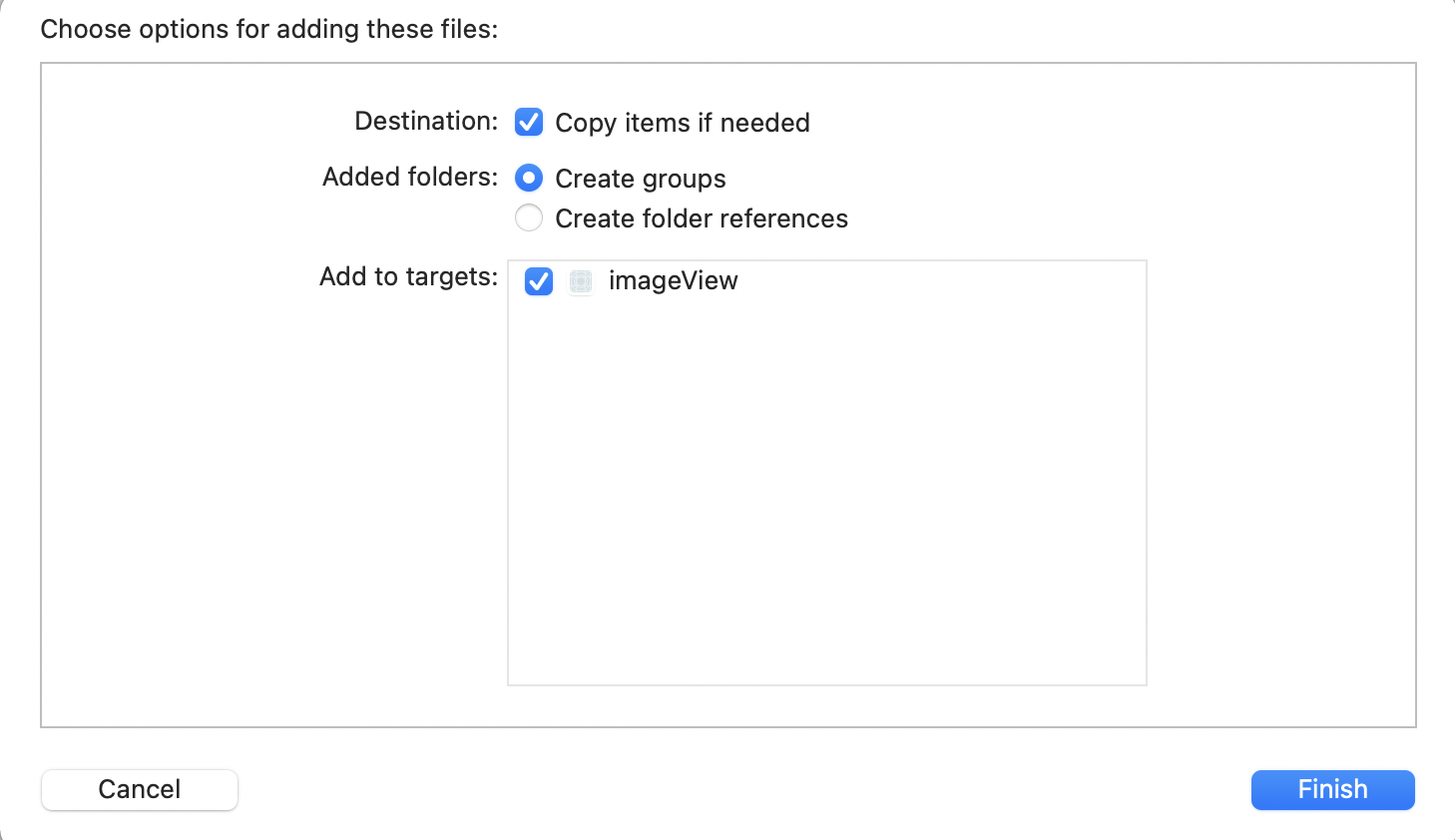 Copy item if needed를 꼭 체크해주자 이유는 이미지 등 다른 파일들을 추가했을 때 프로젝트 폴더로 복사하지 않고 사용 할 경우 원본의 파일이 변경되거나 삭제되었을 때 추가한 파일이나 이미지를 사용할 수 없게된다. 꼭 체크해주자. 그냥 백업이라고 생각하자 쉽게쉽게!
