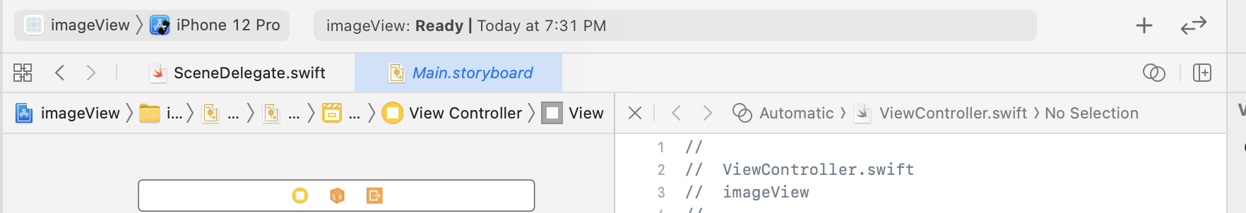 네비게이터에서 Main.Storyboard 선택 후 라이브러리를 열어 Image view를 Storyboard로 끌어와 화면에 배치해보자