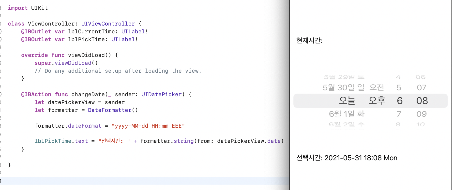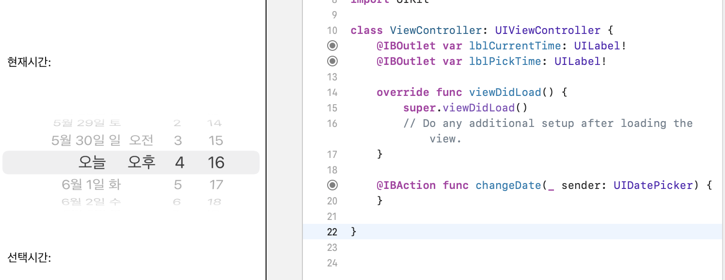 레이블의 아웃렛변수, 데이트피커의 액션함수를 추가해줬다.