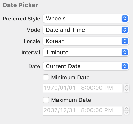 데이트 피커를 추가해준 모습이고 Inspector의 Locale: default 는 영문으로 시간이 표시된다.