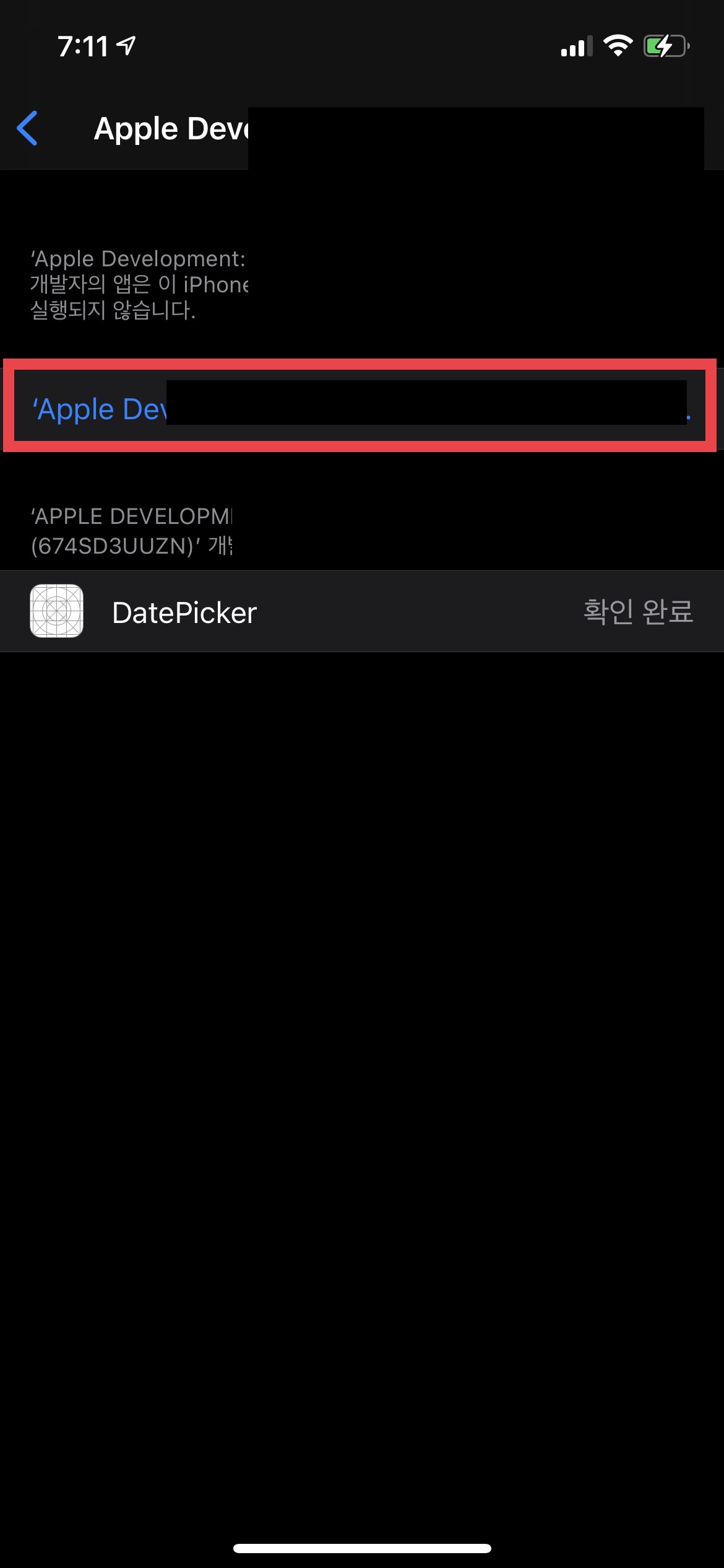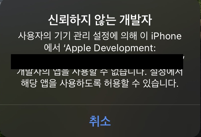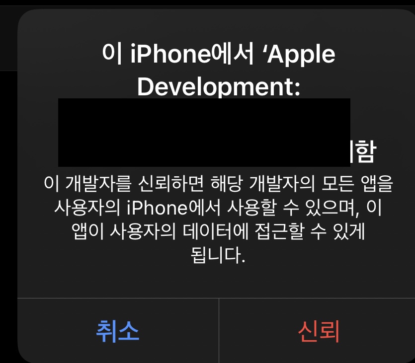 핸드폰엔 신뢰하지 않는 개발자라고 떴다.