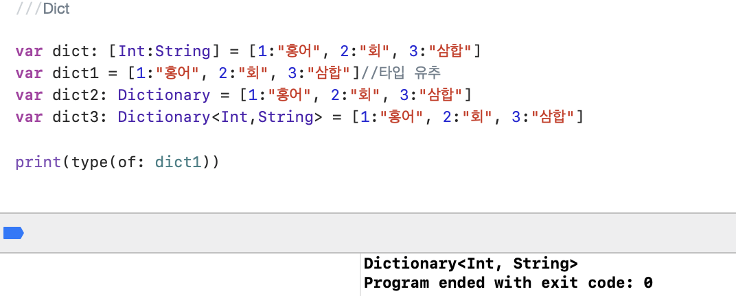 var dict1 = [1:"홍어", 2:"회", 3:"삼합"] //타입 유추