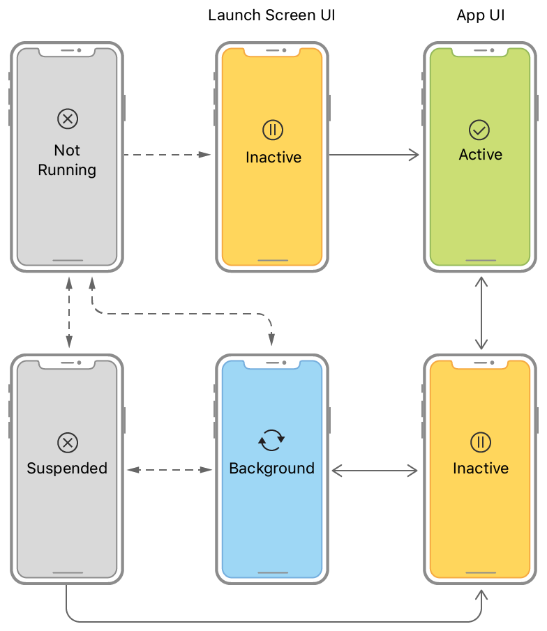 - Inactive: 앱이 전면(Foreground)에서 실행중이지만, 아무런 이벤트를 받지 않는 상태, 앱의 상태 변화 과정에서 잠깐 머무는 단계