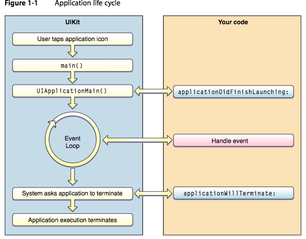 main() 함수가 하는 일은 단순하다. 실행시 시스템으로부터 전달받은 두 개의 인자값(argc, argv)과, AppDelegate 클래스를 이용하여 UIApplicationMain() 함수를 호출하고, 그 결과로 UIApplication 객체를 반환한다. 생성된 UIApplication 객체는 UIKit Framework에 속해 있으므로, 이후의 앱 제어권은 UIKit Framework로 이관된다.