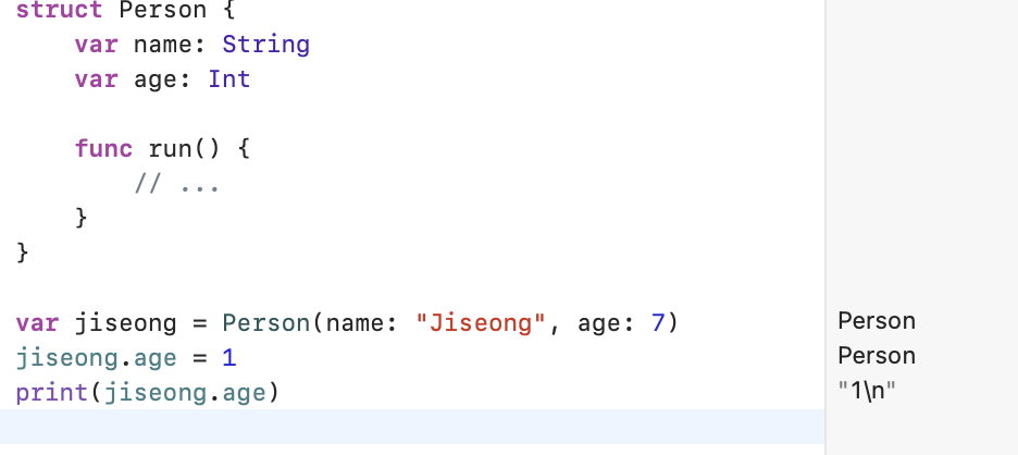 let jiseong = Person(name: "Jiseong", age: 7) // 자동으로 지정