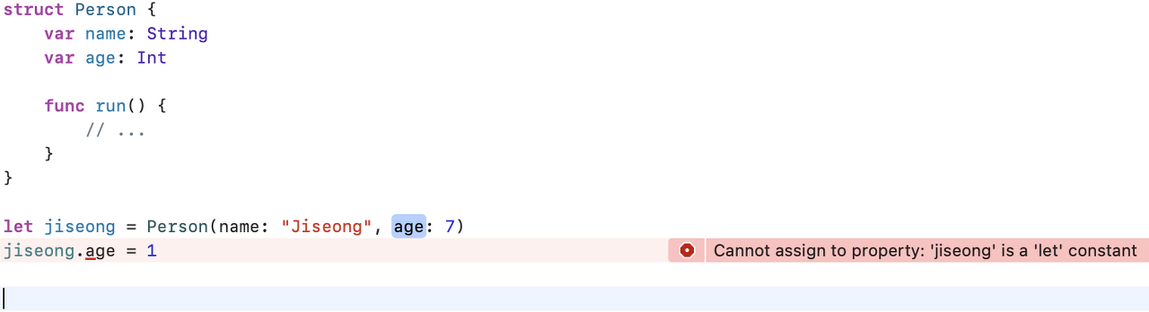 Swift에서 구조체를 인스턴스화할 때 상수에 할당하는 경우, 인스턴스 프로퍼티의 값을 변경할 수 없다.