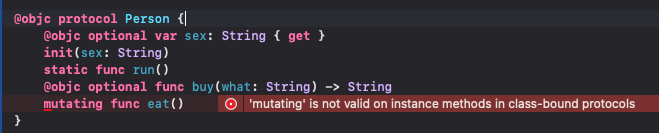 - @objc 키워드를 붙인 프로토콜은 클래스만이 채택할 수 있다. 그렇기 때문에 @objc 키워드를 붙인 프로토콜엔 mutating 키워드를 사용할 수 없다.