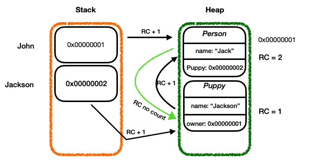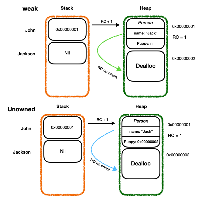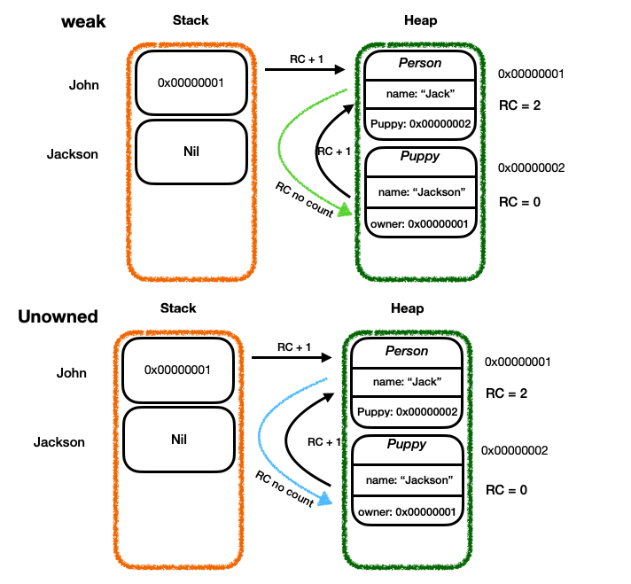 잭슨(Puppy)이 더 빨리 죽으므로 잭슨을 가리키는 존의 puppy 프로퍼티를 weak로존(Person) = nil -> 잭슨.owner = nil = weak 잭슨.owner